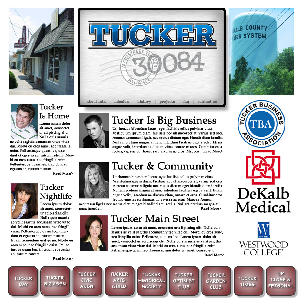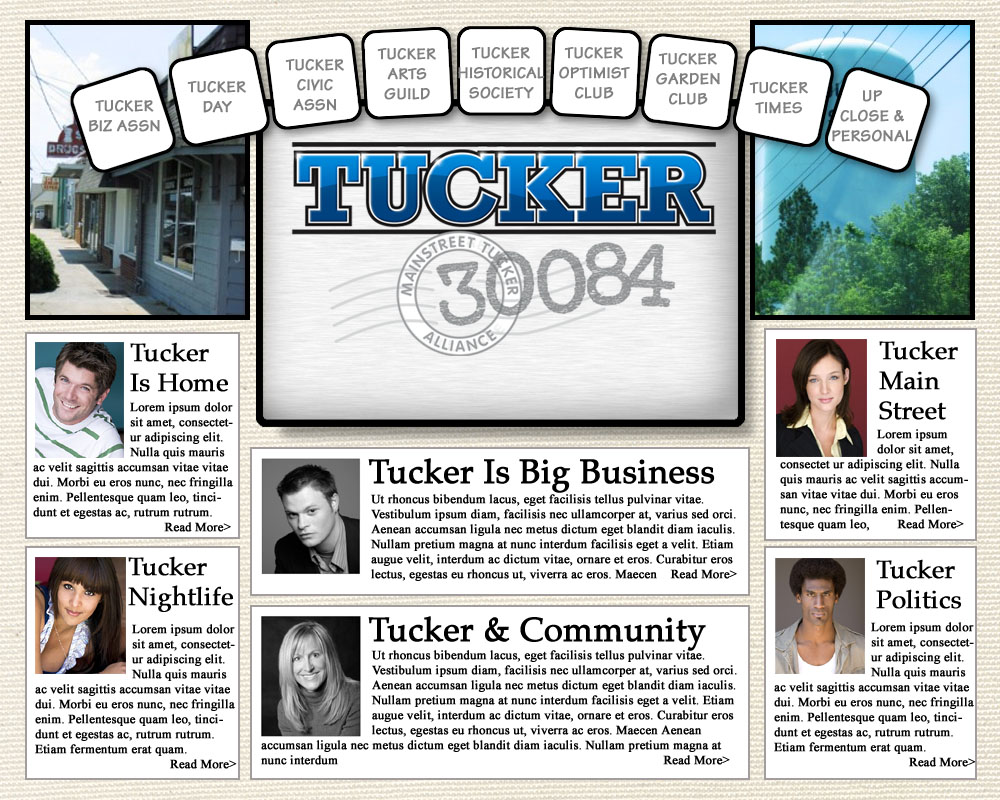 Remember, nothing here is even close to final but we have to start somewhere. Obviously the articles, the buttons, the headlines, the pictures (of people and Tucker) are just space fillers... the real stuff would be far cleaner, tighter and on point... just ideas here. Show this to your committee and let me know your thoughts.