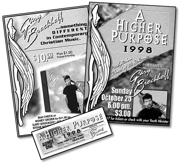 Gary Brockhoff, singer/songwriter of both secular Pop and contemporary Christian music, asked us to create concert tickets and posters for an appearance. We also created jewel case package designs for Gary's CDs (One, Wide Awake, and Clear Blue), as well as the logo for Gary's music production company, 4468 Productions.