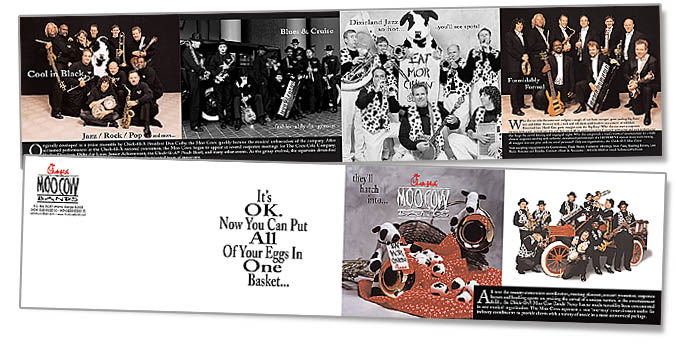 Lee King leads the Chick-fil-A Moo Cow Band and asked us to create a brochure capable of not only marketing the band to prospective clients but also explaining a complicated offering in which the band is capable of playing entire concerts in completely different musical styles. This was a 4-color glossy brochure. We created the marketing campaign and slogan, directed some of the photo shoot, and wrote most of the copy.
