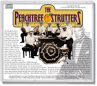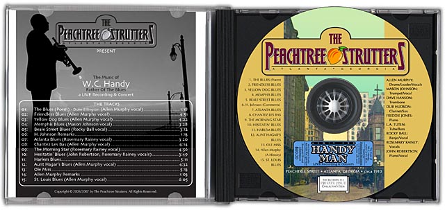 | Allen Murphy leads the Peachtree Strutters, a dixieland jazz band that began in Atlanta in 1954. Allen asked us to create a jewel case package design for this 2006 recording that reflected the heritage of early Atlanta. We started with a logo for the Strutters and then based our CD case design on an old colorized postcard depicting Atlanta's Peachree Street circa 1910. In addition to what is pictured here the CD featured an extensive insert with biographies of all of the musicians. The project was produced in 2 forms... the first 100 CDs were printed, assembled, distributed, and autographed by the musicians. Then a larger print and distribution run was created for CD ROM 2 GO. |