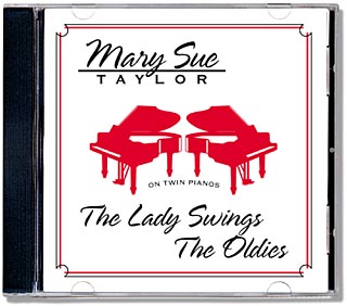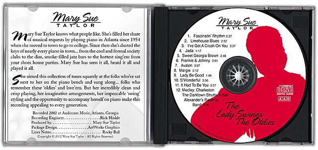 | Mary Sue Taylor is one of the most celebrated veteran piano players in Atlanta with a musical career that spans 5 decades. Mary Sue asked us to create a unique CD jewel case package for her latest offering that features her playing her own arrangements of classic American Songbook standards on 2 pianos... at the same time! Digital technology allows Mary Sue to accompany herself. We chose mirror images of a baby grand for the front and the photograph on the back inspires a silhouette on the disc label. We wrote the copy on this one, as well. The files were produced in a way that allows Mary Sue to print, manufacture, and assemble the CDs herself. |