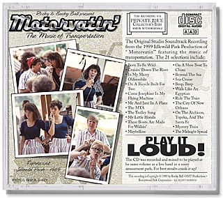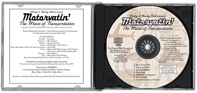 | Rocky and Becky Bal produced musical shows for amusement parks around the country in the 1980s and have now released the digital soundtracks on CD. This show, "Motorvatin'", was a musical revue of the best songs about transportation and modes of travel. Our design featured a custom illustration of a Chevy station wagon along with common icons for transportation like trains, bikes, boats, planes, etc. The front also includes the logo of the amusement park, Idlewild, in Pittsburgh, Pennsylvania. The back featured a series of photographs of the cast along with a list of featured songs. Each of the CDs in this series comes with a detailed insert describing interesting anecdotes and behind-the-scenes details of the production. |