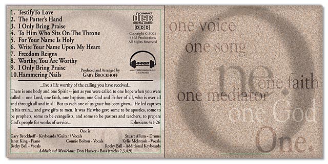 | Atlanta Pop and Christian musician/songwriter Gary Brockhoff asked us to create a jewel case design for the album, One. This was the 3rd music CD Jewel package we created for Gary. The others were Clear Blue and Wide Awake. Additionally, Gary asked us to create a logo for his music production company, 4468 Productions. This project was the collaboration of a praise team called ONE that was for 10 years part of a Christian music outreach program at Presbyterian Church of the Redeemer in Snellville, Georgia. The final package was a single sleeve and disc and was printed and duplicated by Disc Makers. |