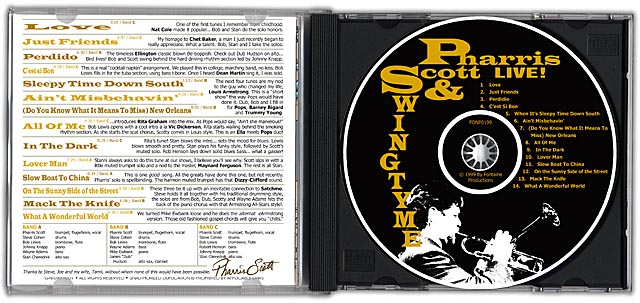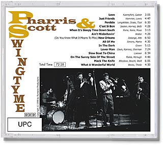 | Pharris Scott and Swingtyme lead Atlanta's music scene wih respect to retro swing and big band jazz. This was recorded live in a popular night club in Atlanta over several nights. The band asked us to fix a problem with the photos, however. The band photo on the back was taken on a night when the regular bass player was absent. They asked us to cut out the sub and 'photoshop' in the regular guy. The effect was seamless. |
