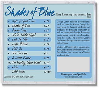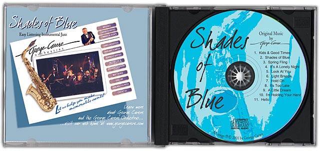 | Atlanta bandleader and saxophonist George Carere commissioned us to create a package for his self-produced instrumental album "Shades Of Blue." George wrote the music and played most of the instruments himself and his talented wife, Ellen, painted the saxophone on the cover. The project was duplicated and printed by Disc Makers. We also designed George's web site, georgecarere.com |