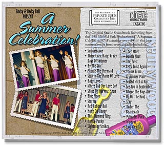 | Rocky and Becky Ball produced musical shows for amusement parks around the country in the 1980s and have now released the digital soundtracks on CD. This show was a musical revue of the best music of summer. Our design featured a post card illustration for an amusement park on the front cover and the logo of the park, Kennywood, in Pittsburgh, Pennsylvania. The back featured a series of photographs of the cast along with a list of featured songs and beach toys. Each of the CDs in this series features a detailed insert describing interesting anecdotes and behind-the-scenes details of the production. |