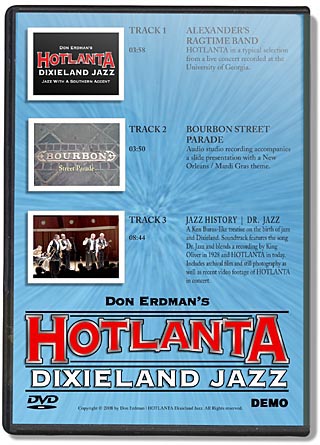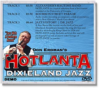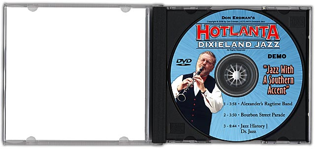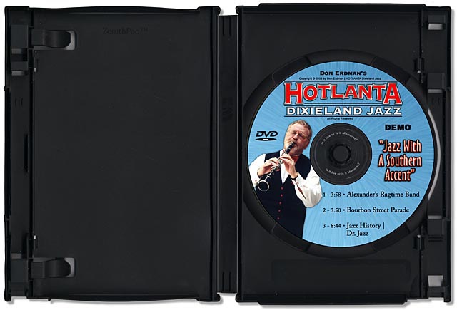 | Don Erdman and his Hotlanta Dixieland Jazz Band asked us to create some DVD packaging for his latest DEMO offering. No only did we create the video content but we designed the packaging in 2 sizes... both in a way that Don could print, manufacture, and duplicate in small quantities from home. |