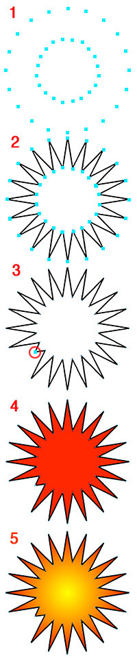 | The starburst at right is stored in the computer as a set of junctions that lines are drawn between, like the connect-the-dots that kids find in coloring books (1). |