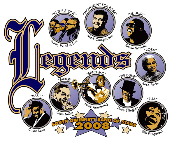 When the South Gwinnett High School Band of Stars needed a custom tee shirt design for their 2001 show "Channel 1 Suite", featuring the music of Chick Corea and Buddy Rich, we responded with a snappy design combining pictures of the 2 legendary jazz giants.