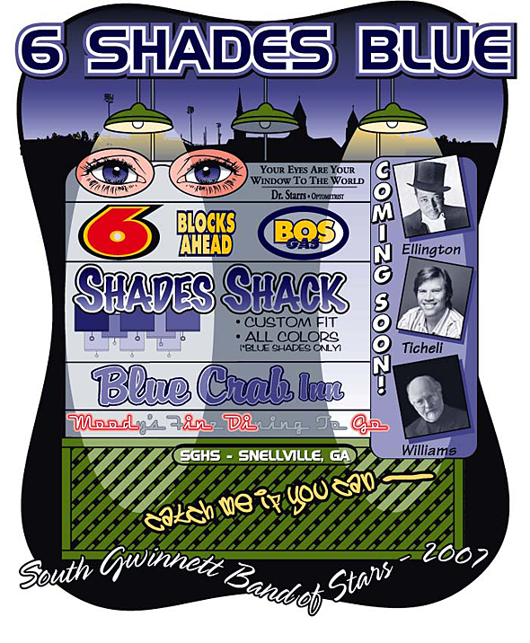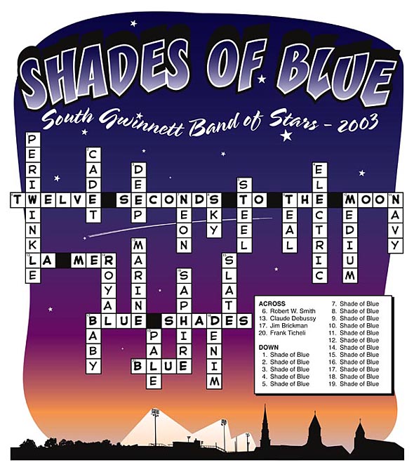 Here the theme is "Shades of Blue" and we mixed a night sky with the distinctive skyline of Snellville, Georgia in silhouette. The crossword puzzle features the names of the selections ACROSS and different shades of blue DOWN. The clues ACROSS feature the names of the composers and the clues DOWN all say a "Shade of Blue." The football team is the COMETS and one can be seen streaking across the sky.