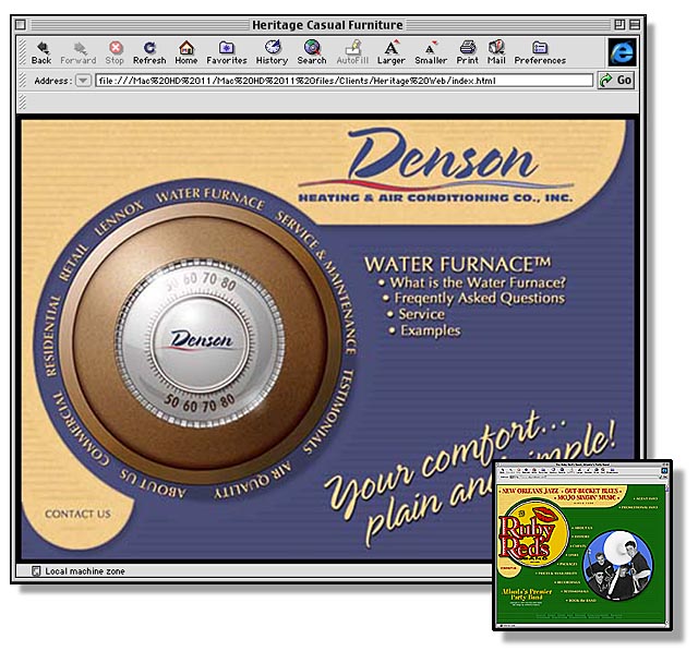 This was a proposal for a web design for Denson Heating & Air. We did not win the contract but included the sketch here because we like the design feature and illustration of a 1960s thermostat that serves as a navigation element. We did, however, design Denson's logo, which sits inside the thermostat dial. Never one to waste a good idea, we adapted several elements of this design into a web site for the Ruby Red's Band.
